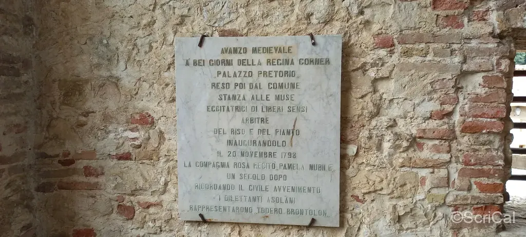 Da qui, dopo aver percorso una breve scalinata, si accede al Castello di Asolo (detto anche Palazzo Pretorio) che è ancora più antico della Rocca, risale infatti al X secolo d.C. ed era sede dei podestà veneziani. Dal 1489 al 1510 ospitò il ritiro a vita privata di Caterina Cornaro. Dall’arco di ingresso si accede a un cortile con giardinetto circondato dalla Torre Civica, dal teatro intitolato a Eleonora Duse e dalla Torre Reata.